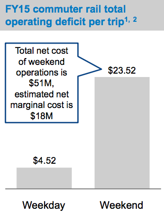 Most of the costs in running weekend Commuter Rail are fixed. The Control Board even admits this (see the screenshot from their report to the right). We already have the trains. We already have the stations. And the track, and the signals, and the crew benefits and all else. According to the Control Board documents, the average weekend subsidy per ride is $23.52. Assuming the average fare paid is in the $6 range, fares cover only 20% of the costs of running the trains on the weekends (overall, fares pay about 50% of the cost of Commuter Rail). But let’s assume that weekend Commuter Rail trains are accounted for at the rate of the CapeFlyer: $22.50 per train mile [2]. If we only count those costs, the total cost per passenger drops from $29.52 to between $4.52 and $10.33 [3]. That’s a lot less than $30, and in some cases, less then the average fare. So, using the same “innovations” that the CapeFlyer uses to turn a profit, weekend Commuter Rail service might well be able to turn a profit, too. Even if you assume that weekend service would use shorter trains (and therefore cost less) it would certainly require less than a $30 subsidy for each passenger. [4]